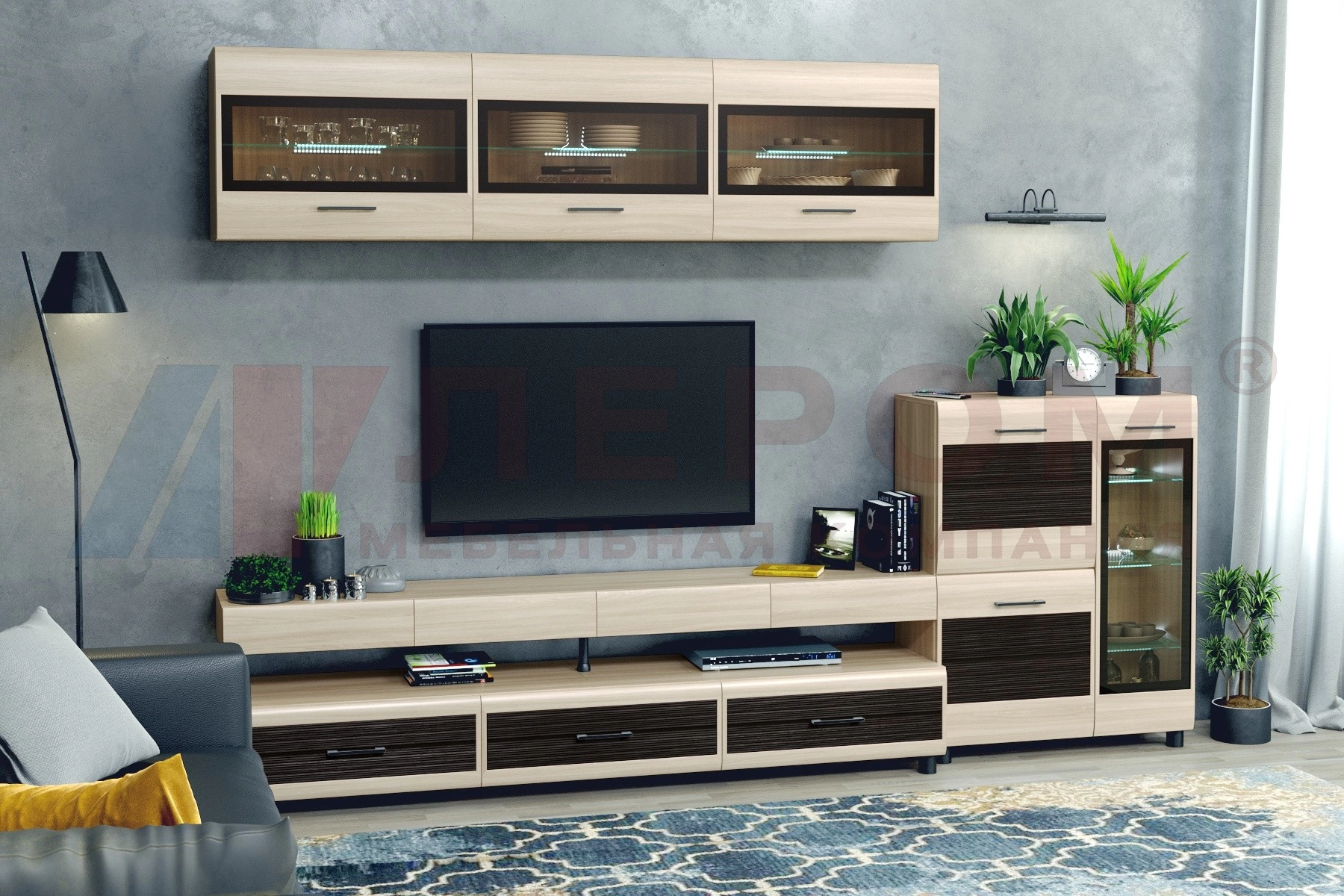 Корпусная мебель для гостиной "Камелия" - это модульная мебель. Фасады с комбинированными вставками имитируют специальную технологию "браширования". Мебель изготавливается из высококачественных материалов: ЛДСП, МДФ (фасад), стекло фасадов с оттенком "графит". Петли в программах «Камелия» комплектуются доводчиками фирмы "Titus", которые обеспечивают бесшумное закрытие створки. Выдвижные ящики в программах «Камелия» комплектуются направляющими Quadro фирмы Hettich, которые обеспечат долгую превосходную функциональность. Встроенный демпфер Silent System позволяет закрывать ящик плавно и бесшумно. Скрытый монтаж делает механизм в нижней части ящика невидимым глазу, что позволяет не нарушать элегантный дизайн. Варианты цветового решения: «Ясень Асахи», «Гикори Джексон светлый», «Гикори Джексон темный» и «Снежный ясень».